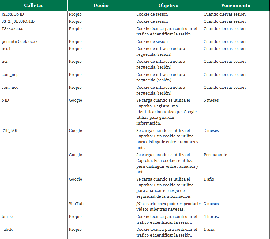 Verificar la conexión con los servidores (por ejemplo, con Oracle). En estos casos, estas cookies pueden ser de terceros, pero siempre cumplen la finalidad descrita.